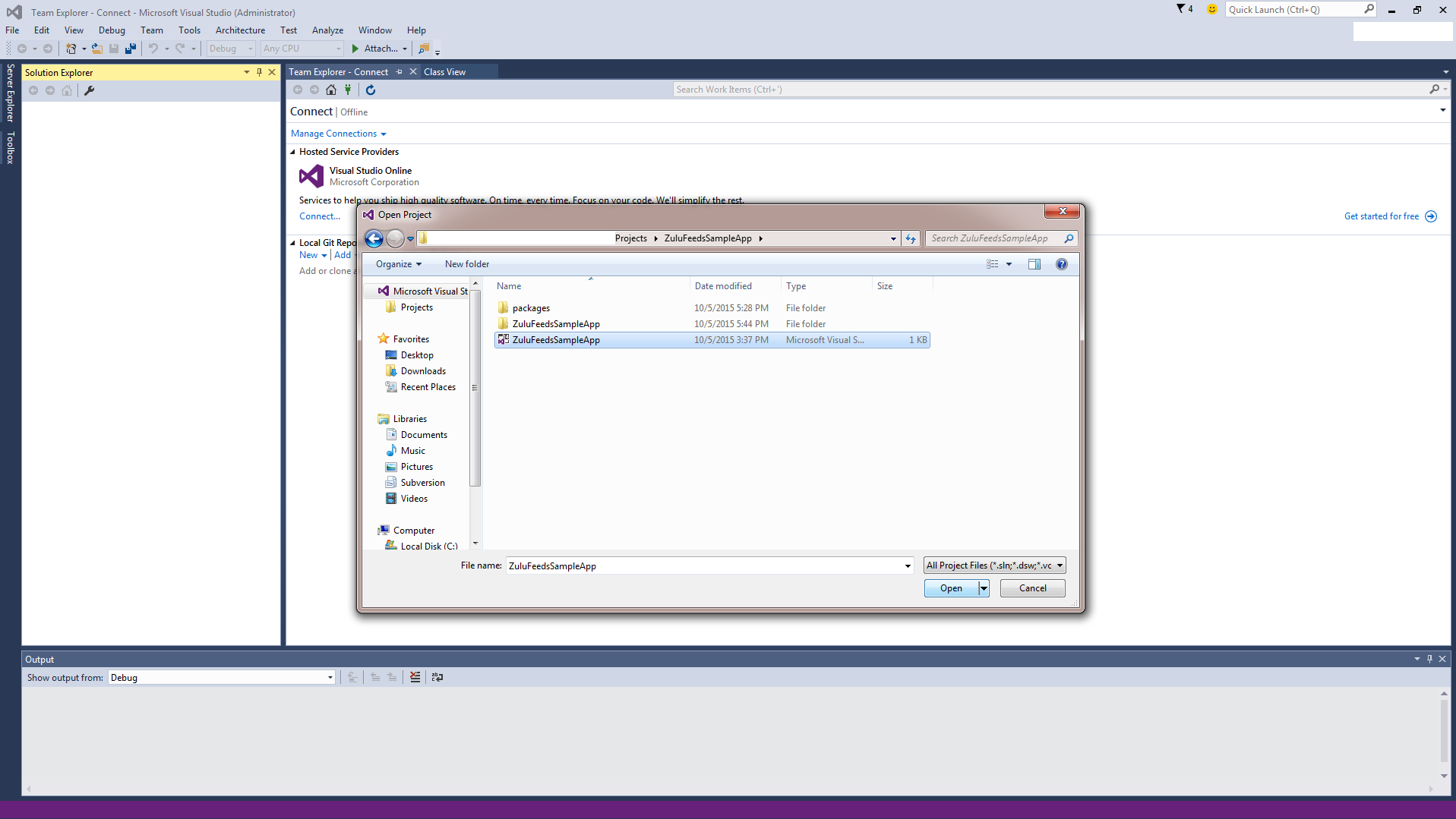 Navigate to the unzip folder, select the ZuluFeedsSampleApp solution and press Open