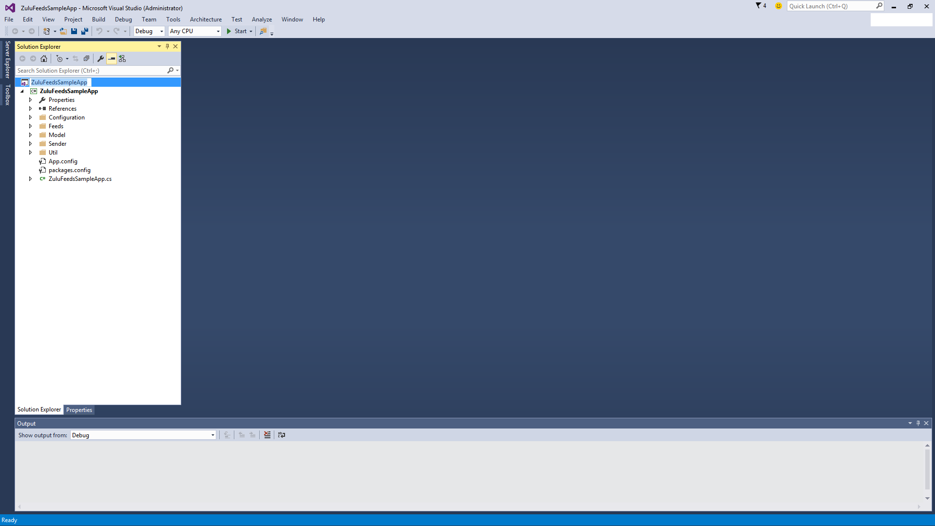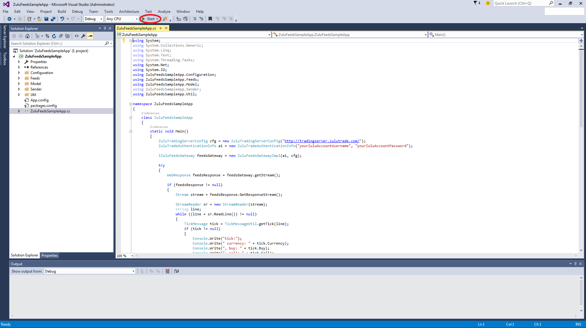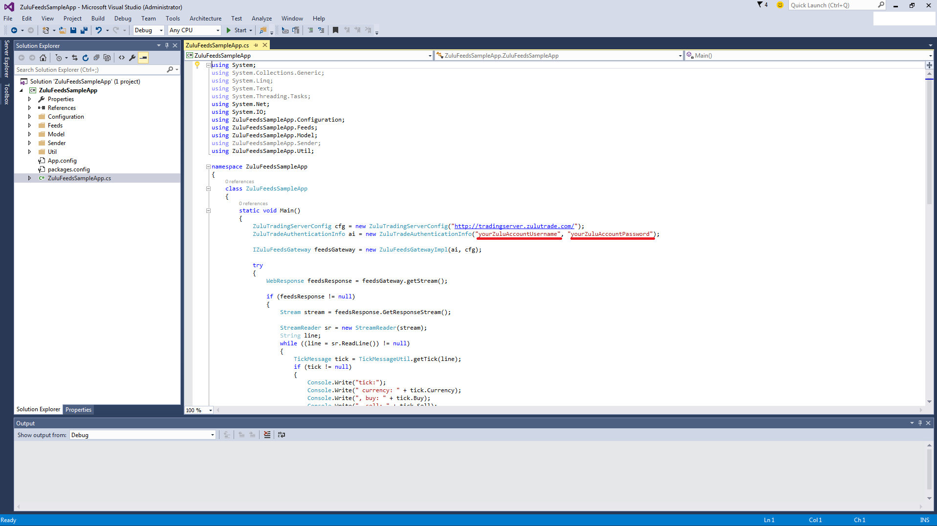 Using the editor, fill in your zulu account credentials and save "ZuluFeedsSampleApp.cs" (Ctrl+s)