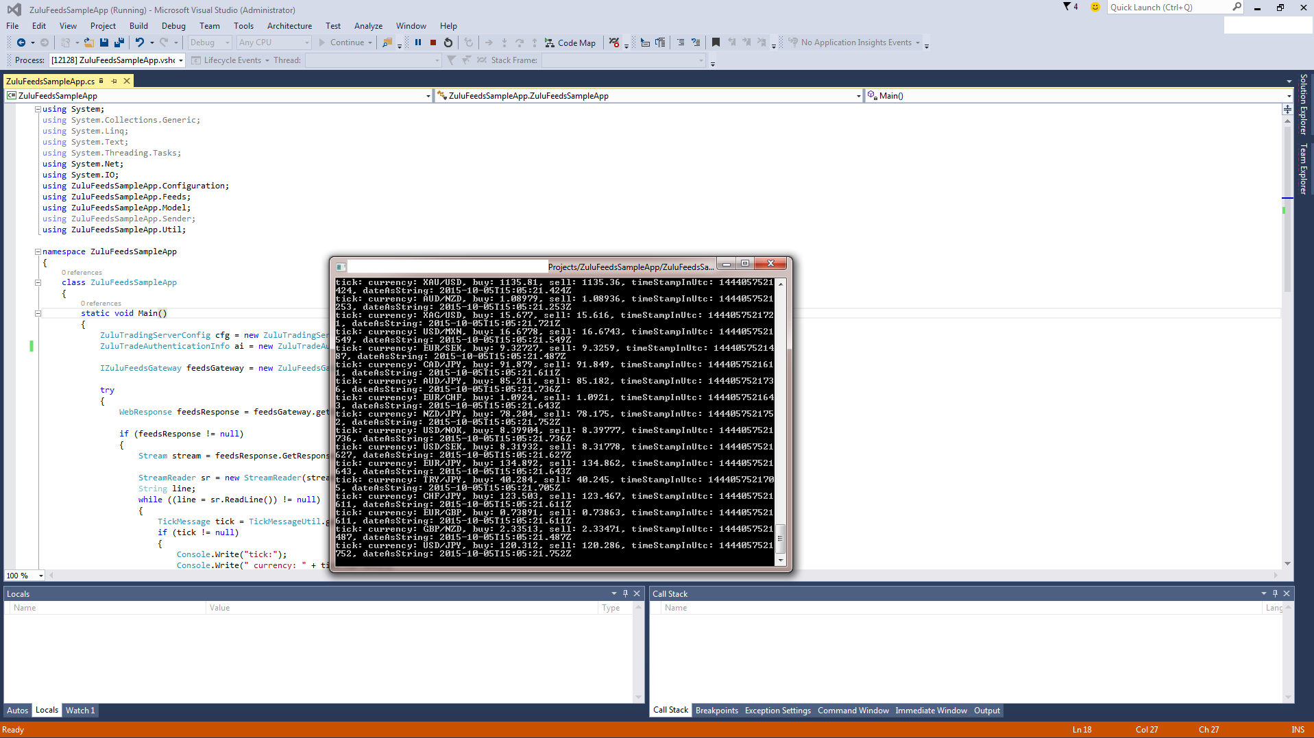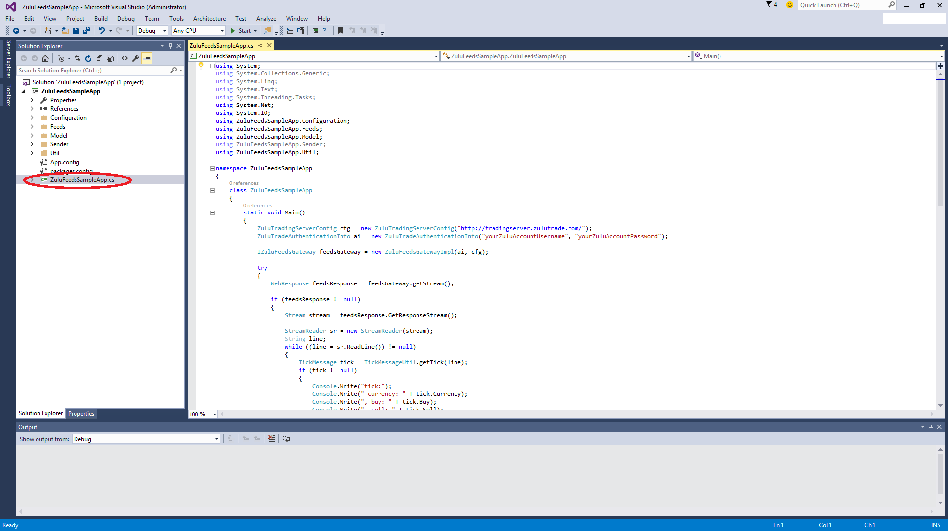 Navigate in solution and open "ZuluFeedsSampleApp.cs", the source will open in editor file