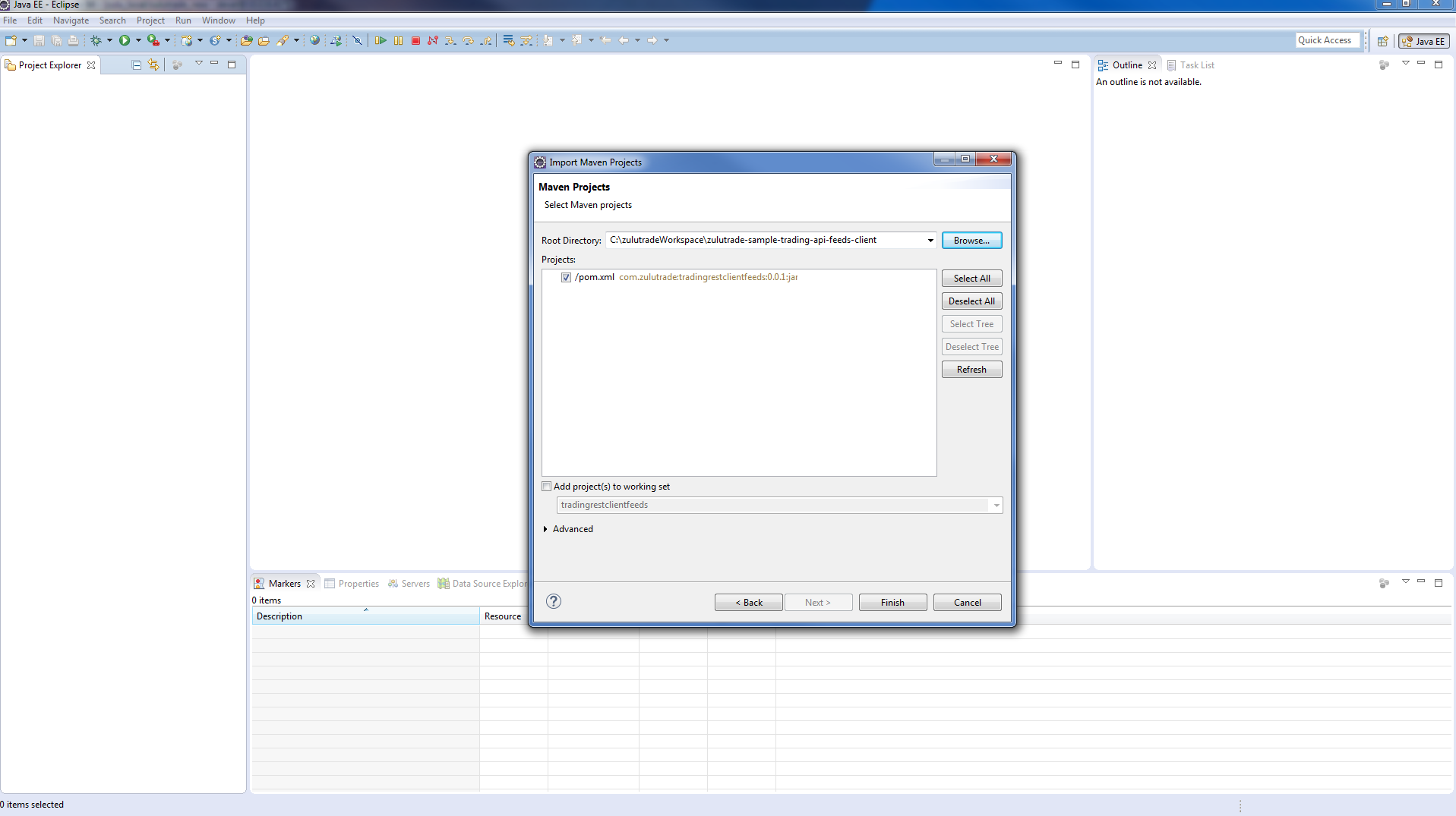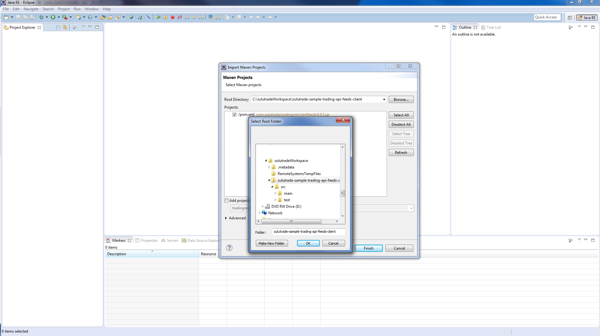 Navigate to "C:\zulutradeWorkspace", select "zulutrade-sample-trading-api-feeds-client.rar" and press "OK"