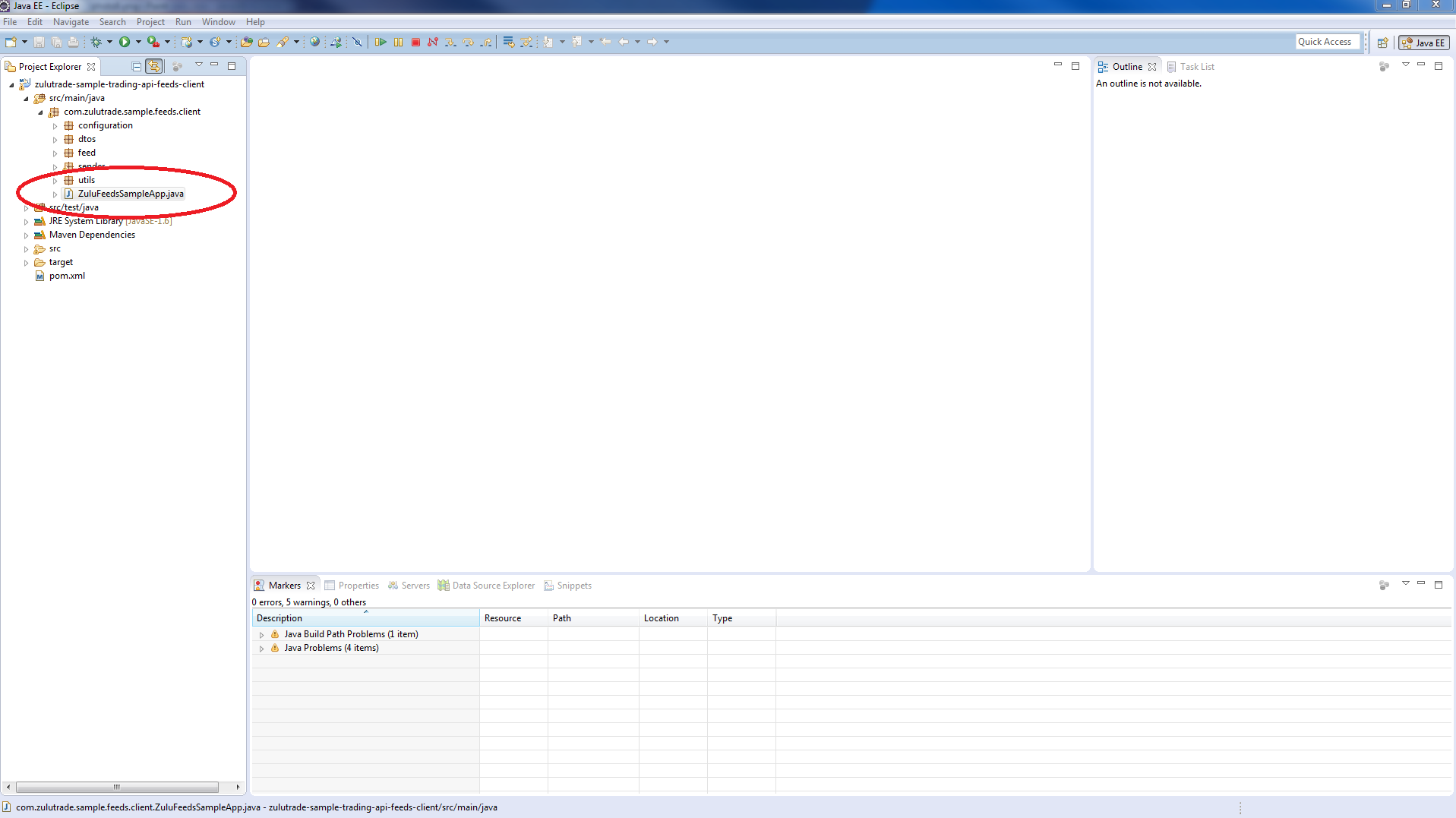 Navigate in project and open ZuluFeedsSampleApp.java, the source will open in editor file