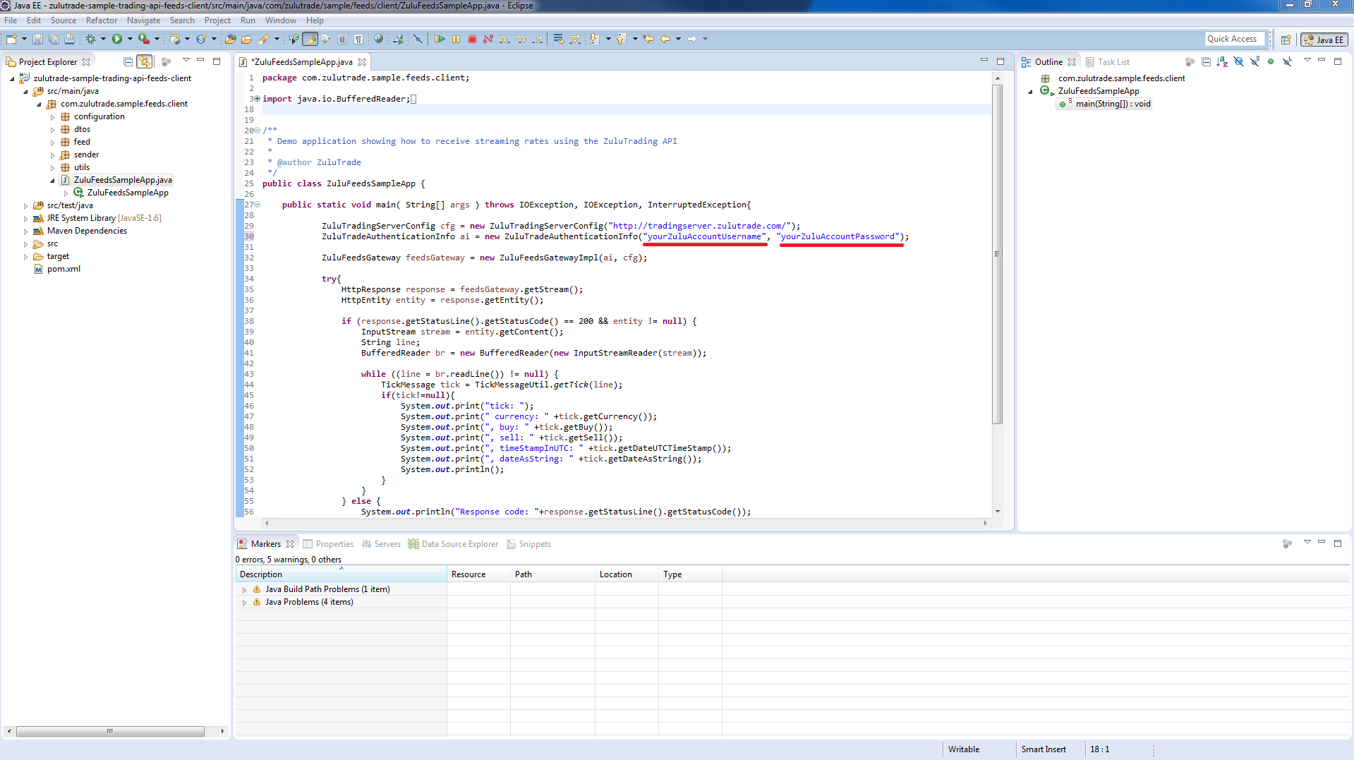 In editor fill in your zulu account credentials and save "ZuluFeedsSampleApp.java" (Ctrl+s)