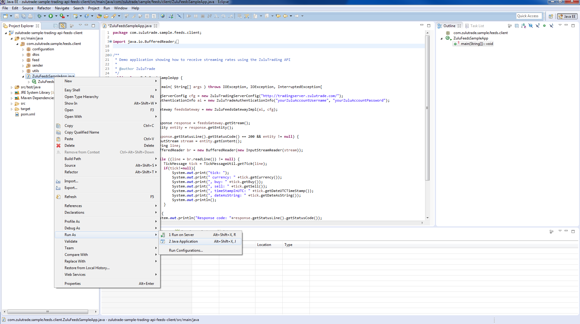 Go to ZuluFeedsSampleApp, right click, Run as-> Java application