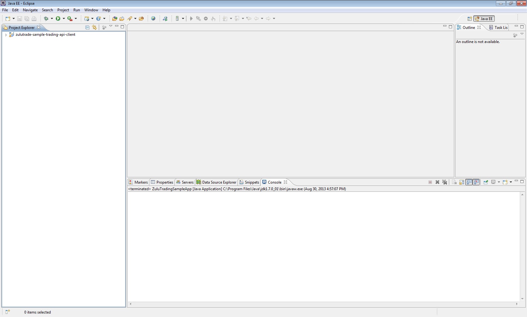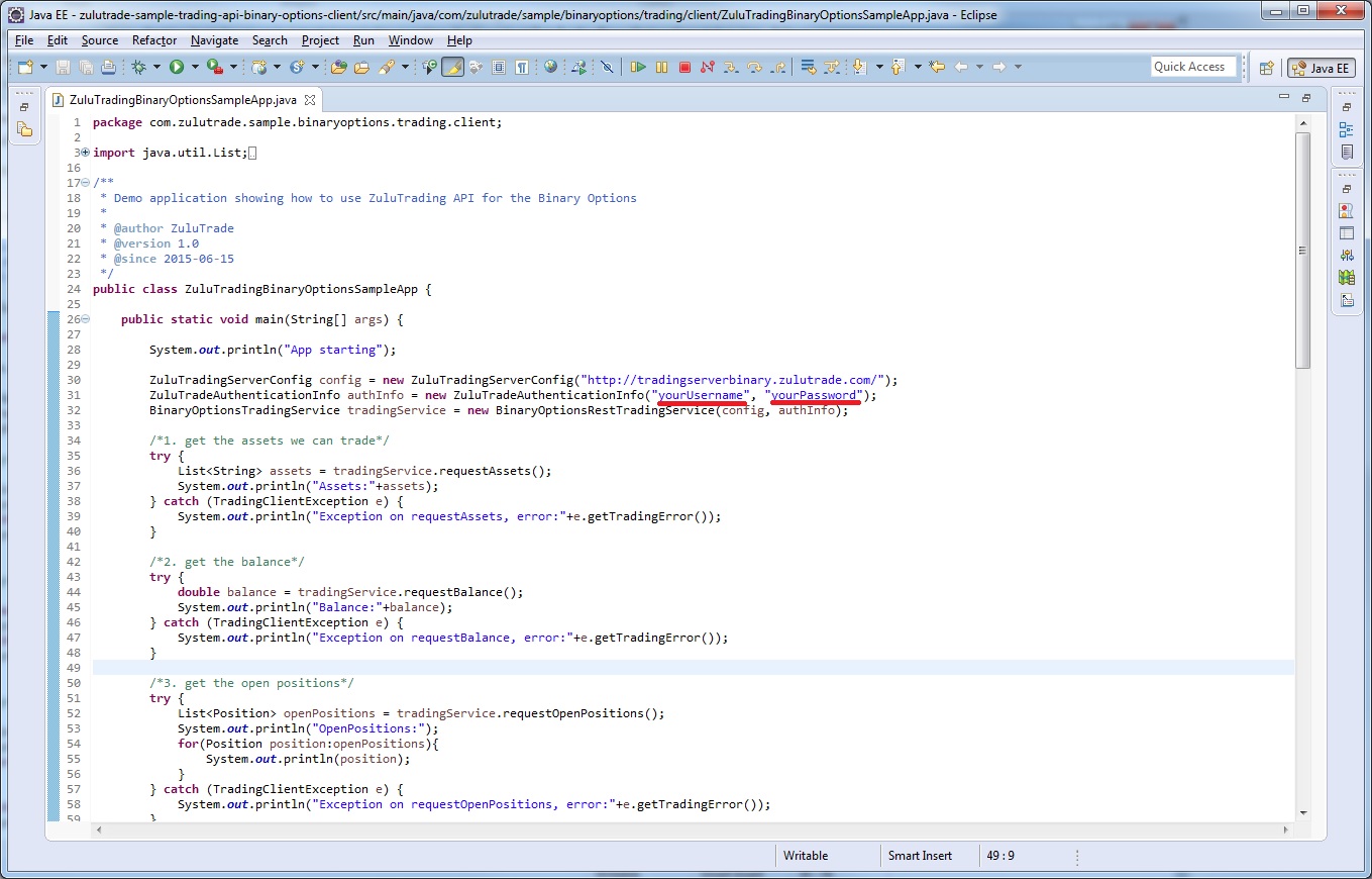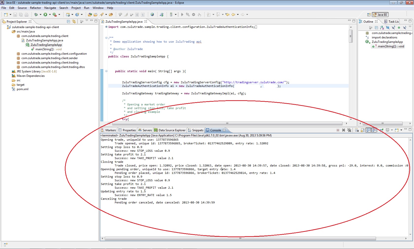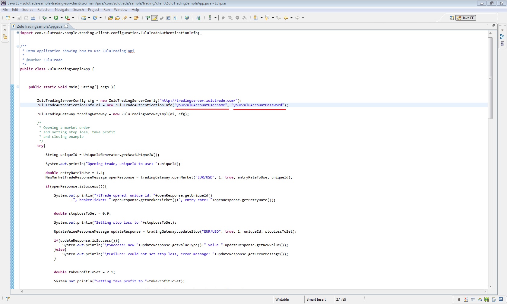 In editor fill in your zulu account credentials and save "ZuluTradingSampleApp.java" (Ctrl+s)