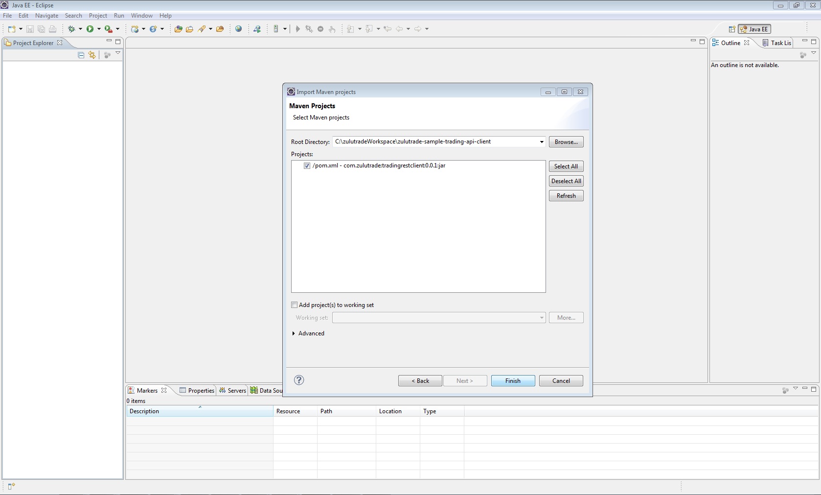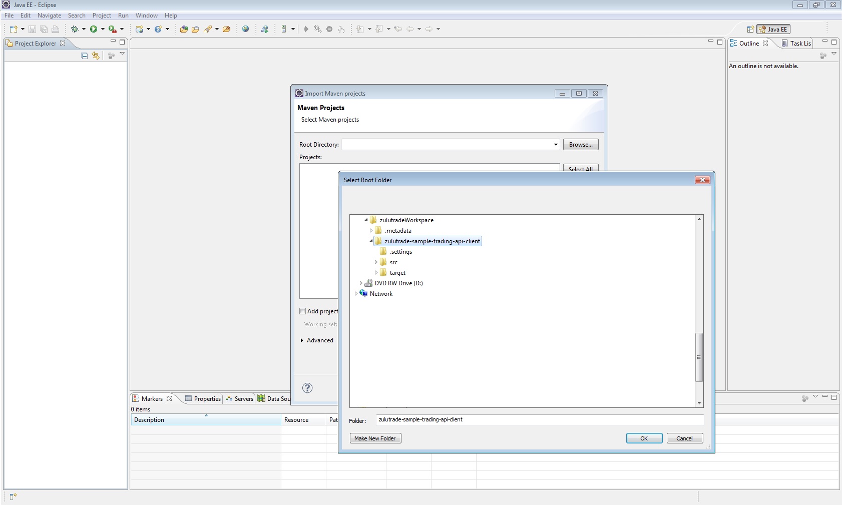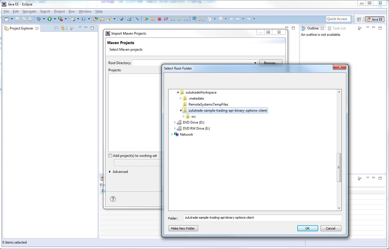 Navigate to "C:\zulutradeWorkspace", select "zulutrade-sample-trading-api-client" and press "OK"