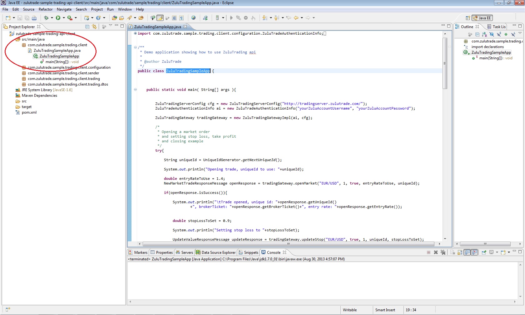 Navigate in project and open ZuluTradingSampleApp.java, the source will open in editor file