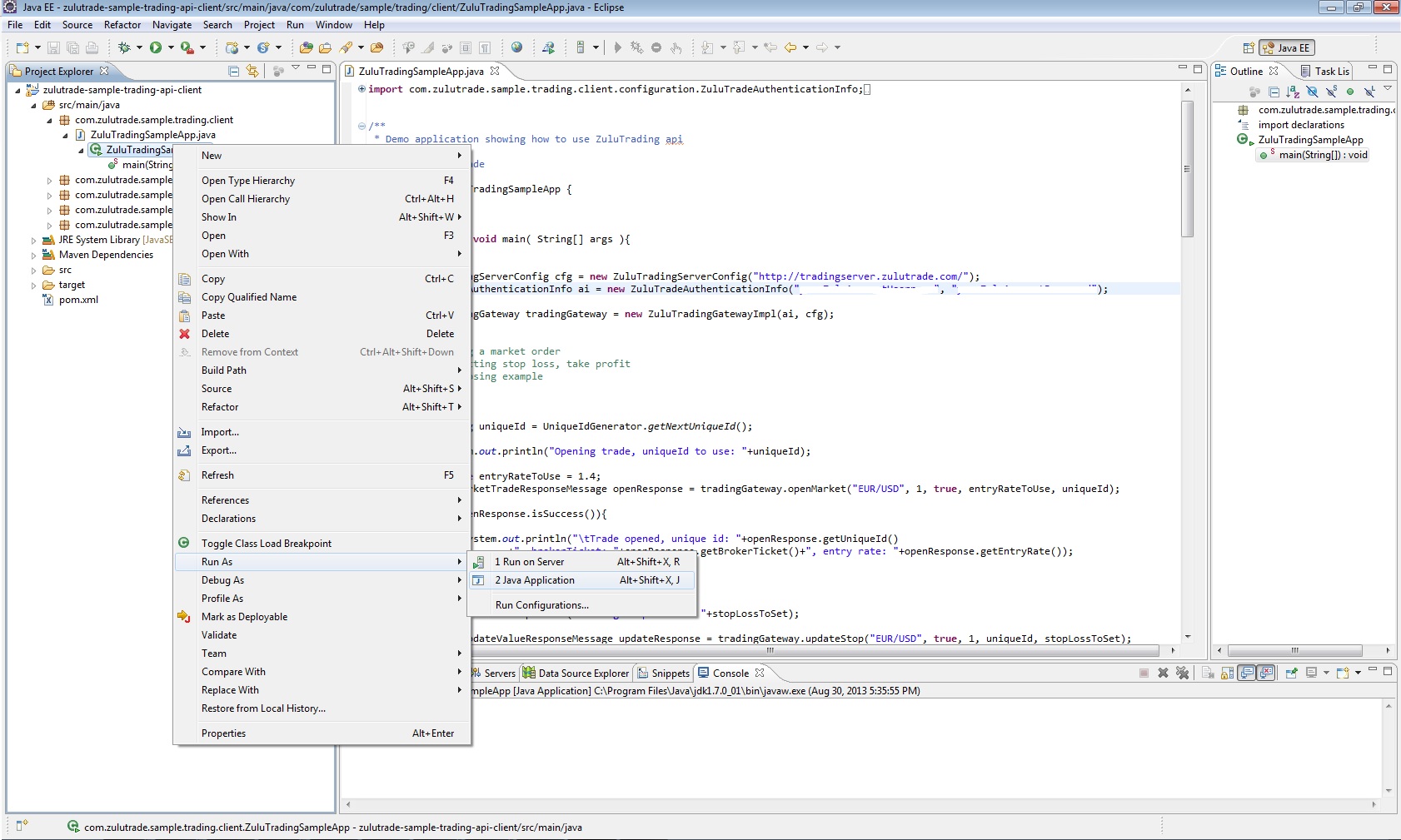 Go to ZuluTradingSampleApp, right click, Run as-> Java application