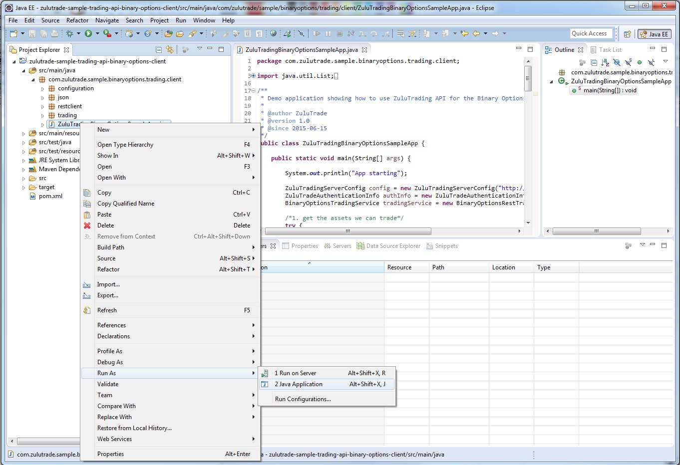 Go to ZuluTradingBinaryOptionsSampleApp, right click, Run as-> Java application