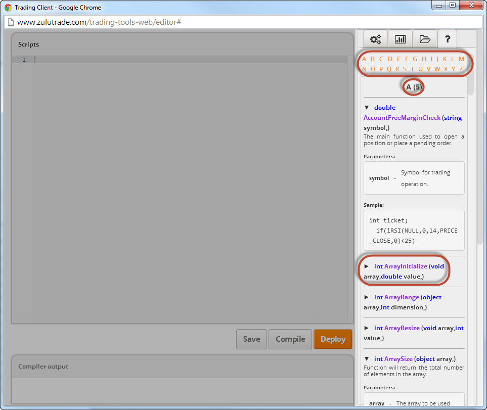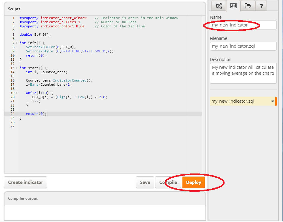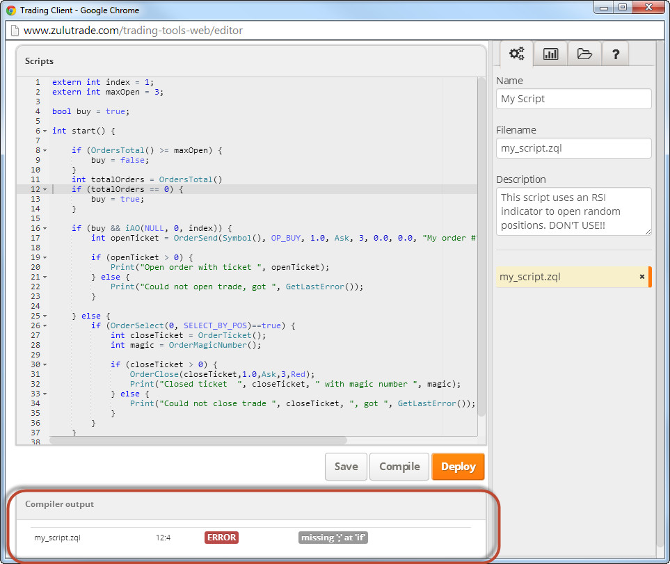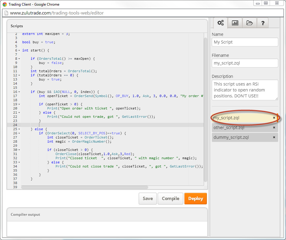 Deploy (Разположете) - За да разположите скрипта, той трябва първо да е бил компилиран. След като това е изпълнено и .zql файлът е създаден, можете да разположите скрипта и да го имате на разположение за използване на станцията за търговия в ZuluTrade!