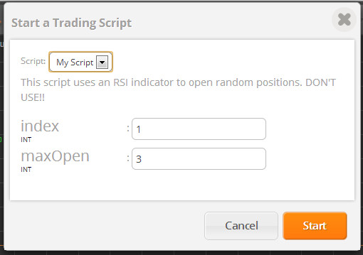 За да стартирате скрипта на избраната Графика/времеви период, просто кликнете върху името на скрипта и ще се появи нов прозорец, който съдържа описанието на скрипта, както и всички полета за инициализация на външните променливи на скрипта.