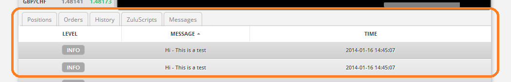 Раздел Messages (Съобщения) - Всички съобщения от вашия скрипт, отпечатвания, съобщения от ZuluTrade относно вашия скрипт и т.н. ще се появят в този раздел.