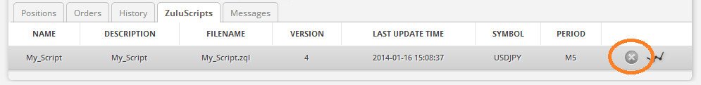 Спиране на скрипт - За да спрете изпълнението на скрипт на Графика/период, е достатъчно да отидете в раздела „Trading Scripts“ (Скриптове за търговия), да кликнете върху бутона „x“ вдясно от скрипта, който искате да спрете, и да потвърдите спирането в съответния изскачащ прозорец.