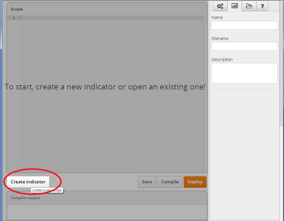 За да създадете персонализиран индикатор, трябва да кликнете върху бутона „Create Indicator“ (Създайте индикатор) на редактора на скриптове.
