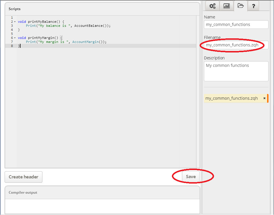 Забележка II: Хедърите само се записват. Не е необходимо компилиране или разполагане, тъй като кодът ще бъде компилиран и разположен, когато бъде импортиран от скрипт или персонализиран индикатор.